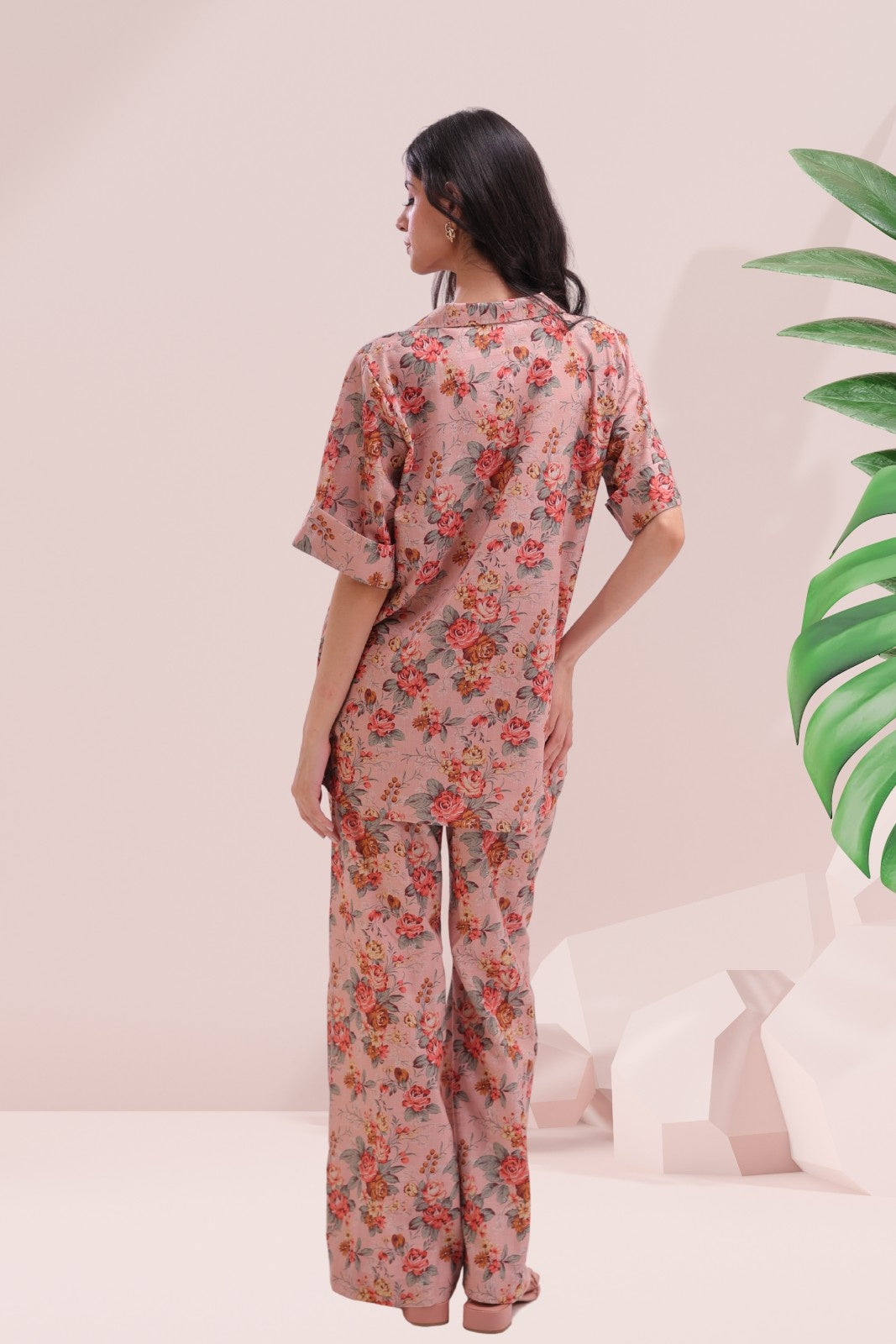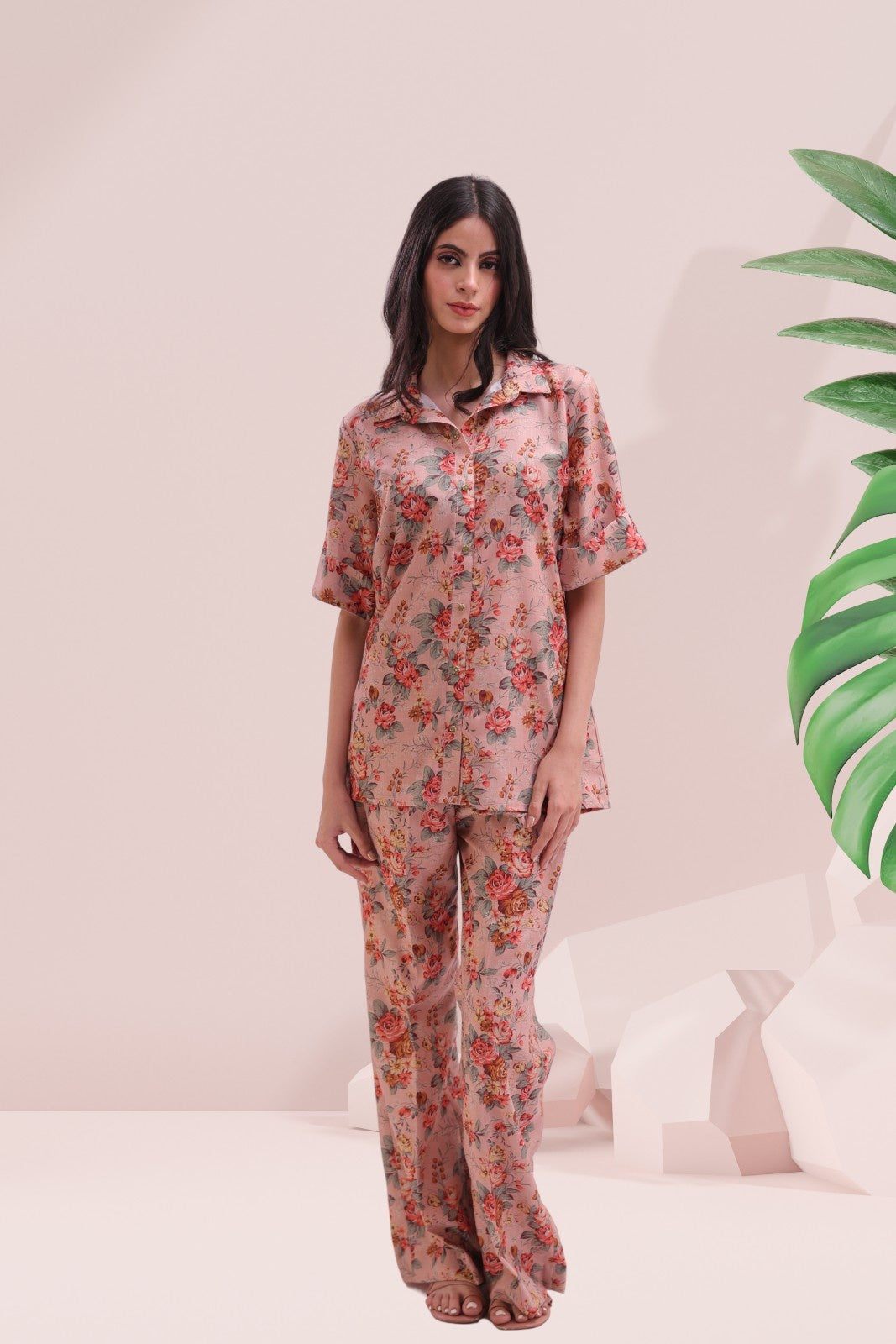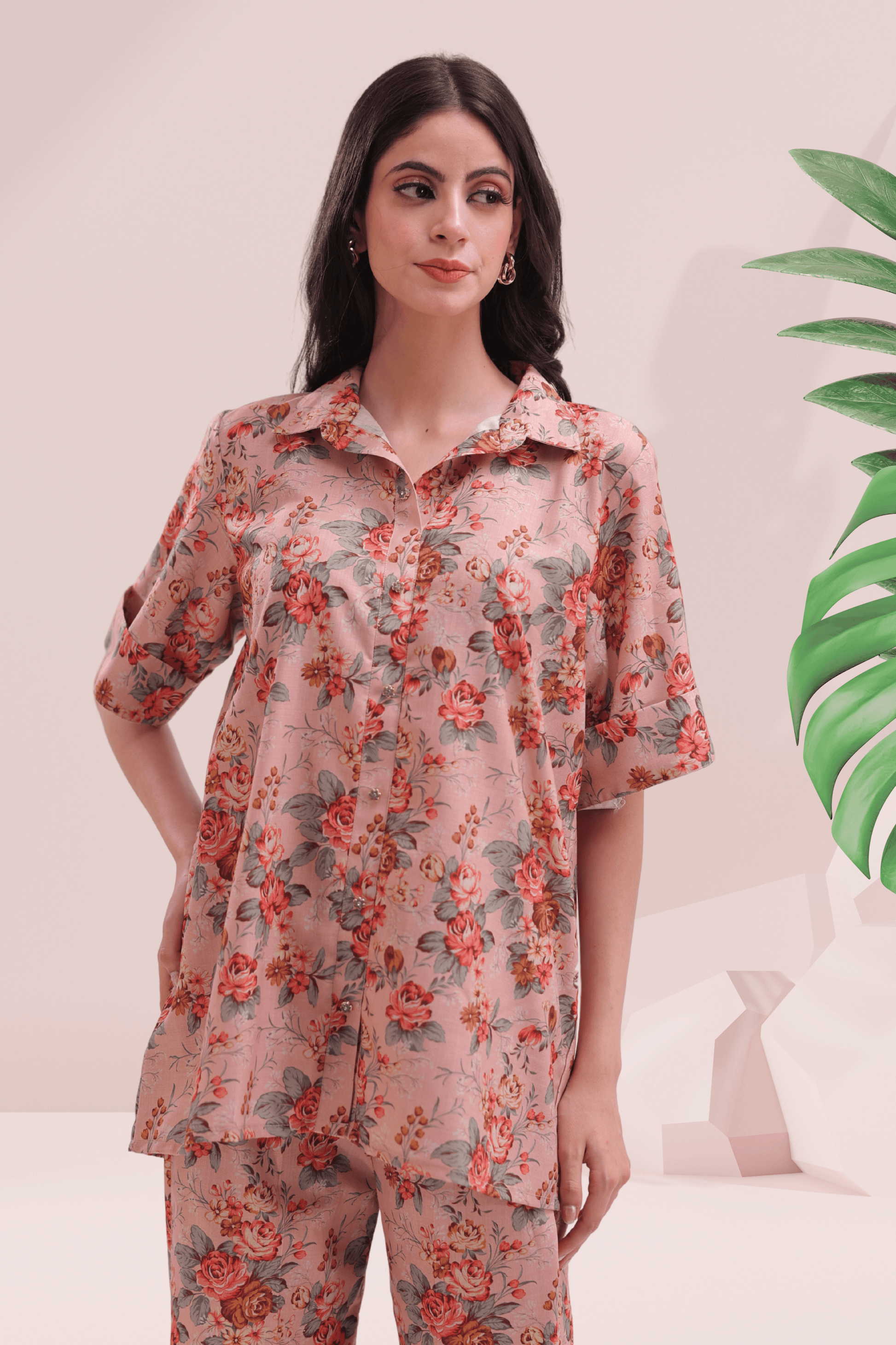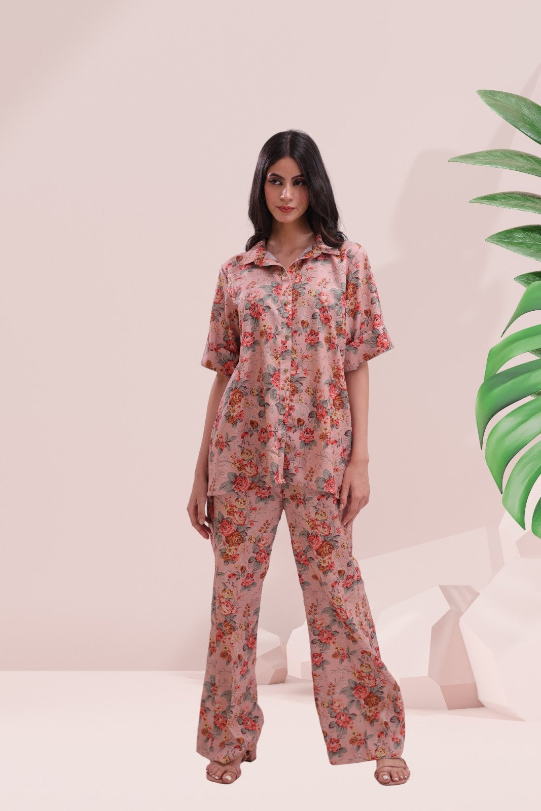 The button-down shirt features a classic collar, dropped shoulders, and short sleeves embellished with floral buttons – a perfect blend of ease and refinement. Paired with wide-leg pants, this floral co-ord makes a strong case for stylish lounging, airport looks, or weekend brunches.