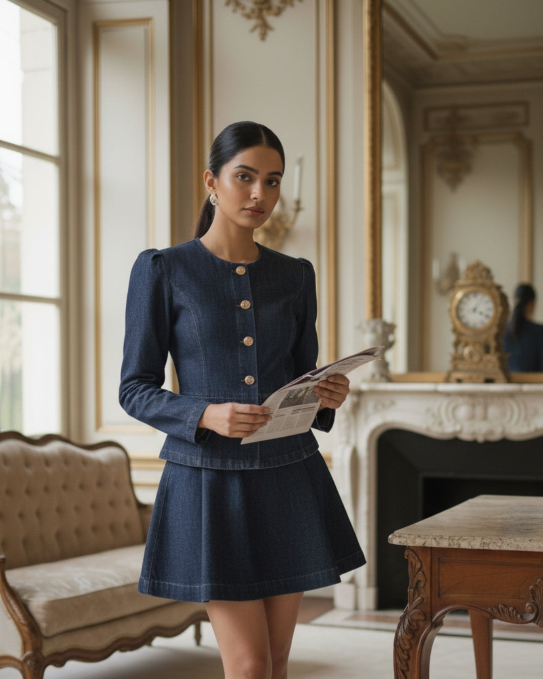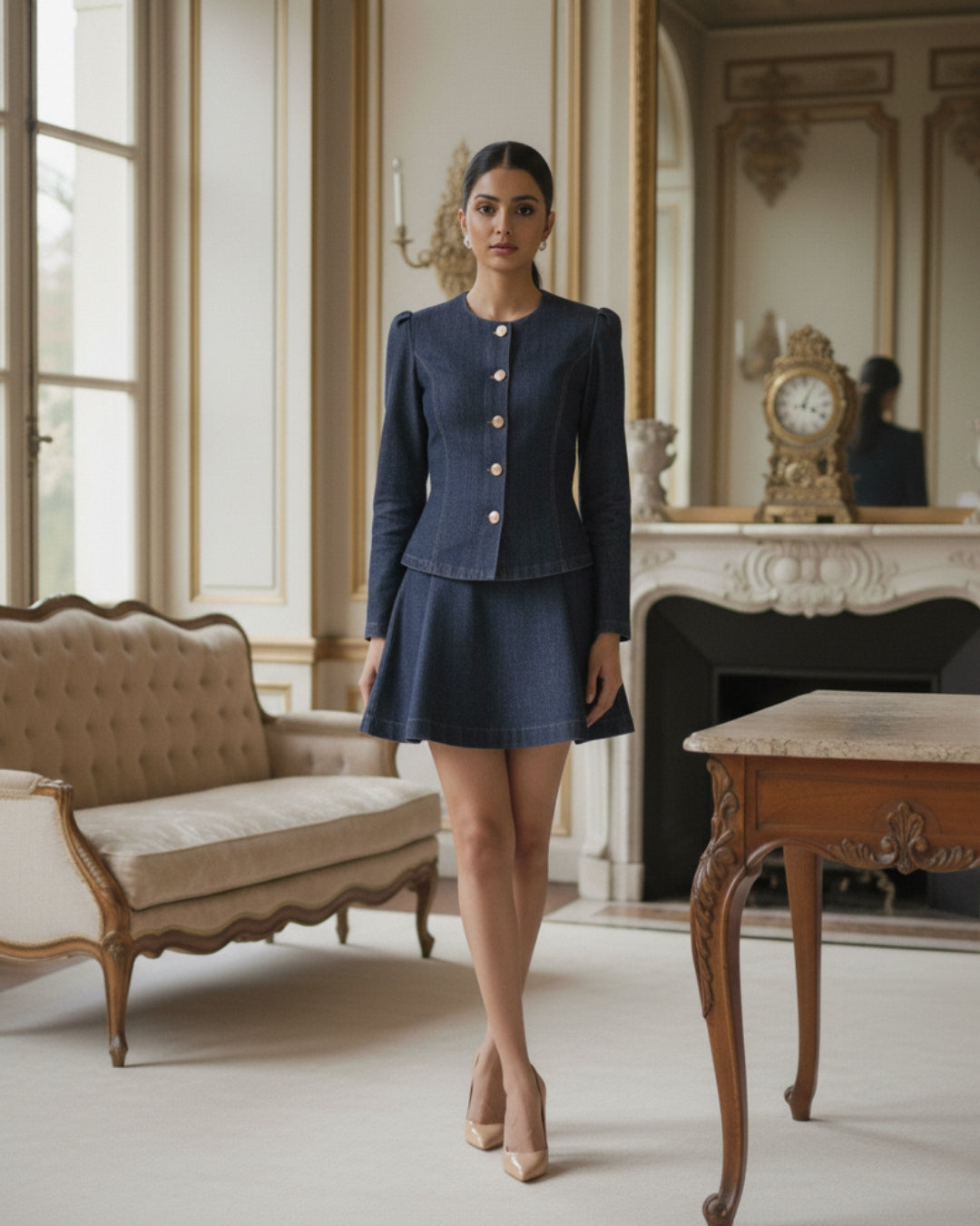 The matching denim mini skirt features soft pleating that creates movement without losing the polished aesthetic. Together, the set delivers a modern, editorial look — effortless for brunches, casual winter evenings, chic city outings, or travel days when style matters.
