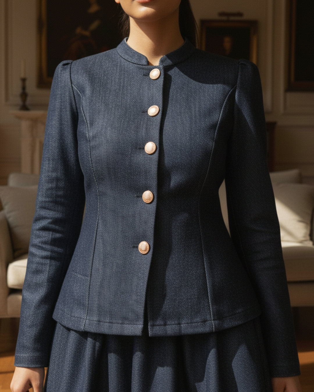 The jacket is cut from premium indigo denim with a sculpted silhouette that highlights the waist and shoulders. Clean seam lines and the mandarin-inspired neckline elevate the structure, while metal buttons add a touch of timeless femininity.