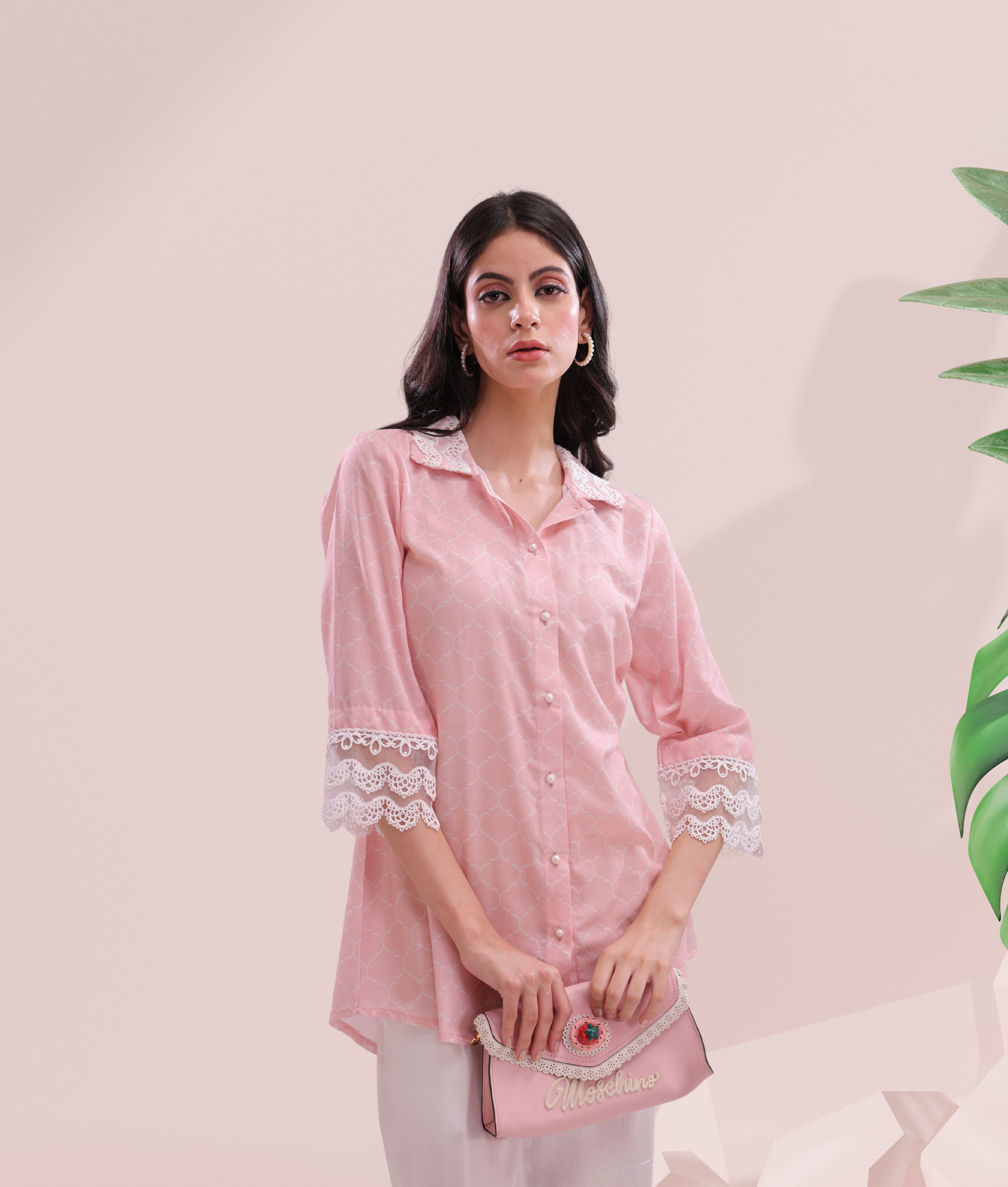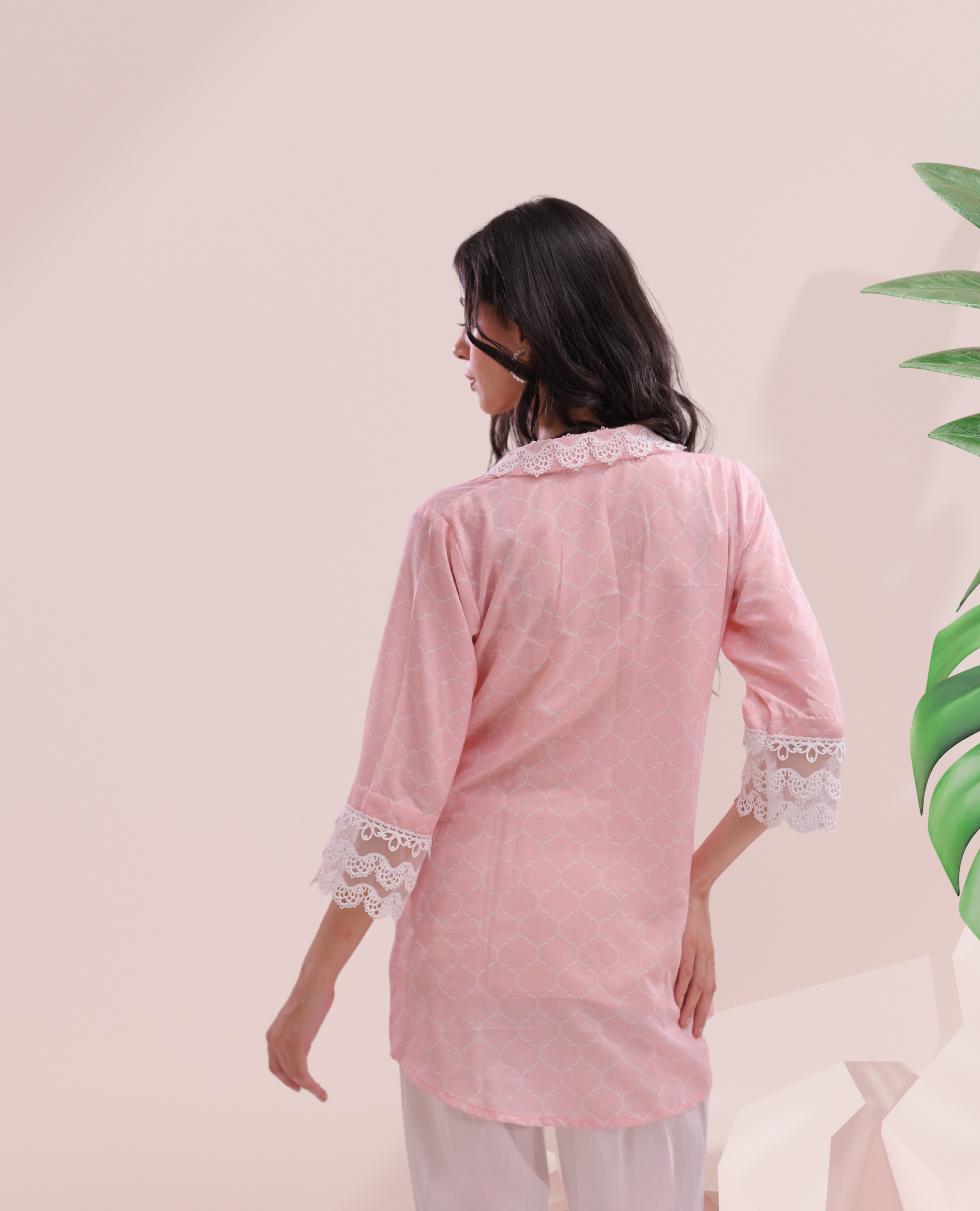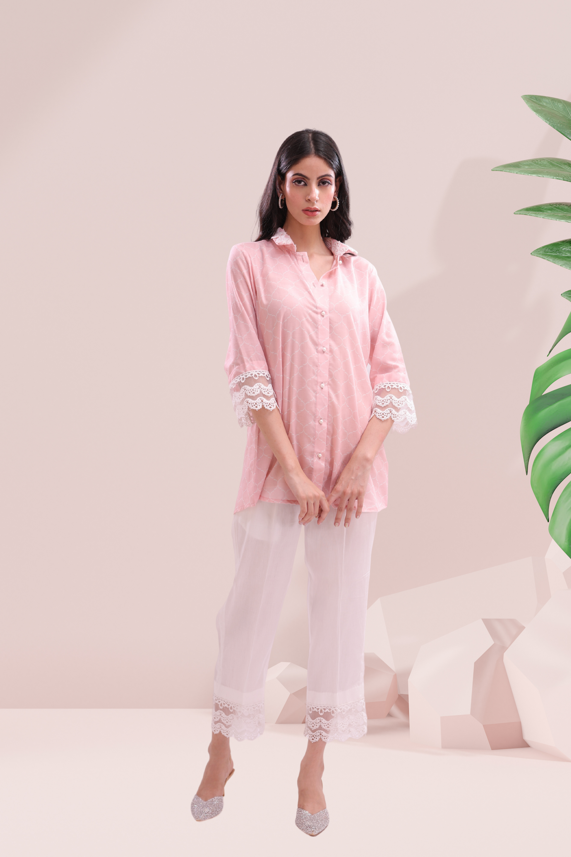 An effortless balance of charm and comfort, the Dew Lace Co-ord Set is crafted in soft cambric and designed to flatter. The pink printed shirt features delicate lace detailing along the sleeves and collar, offering a refined feminine touch. It is paired with tailored white cotton cigarette pants with lace-trimmed hems — making it a versatile outfit for both work and weekend wear.