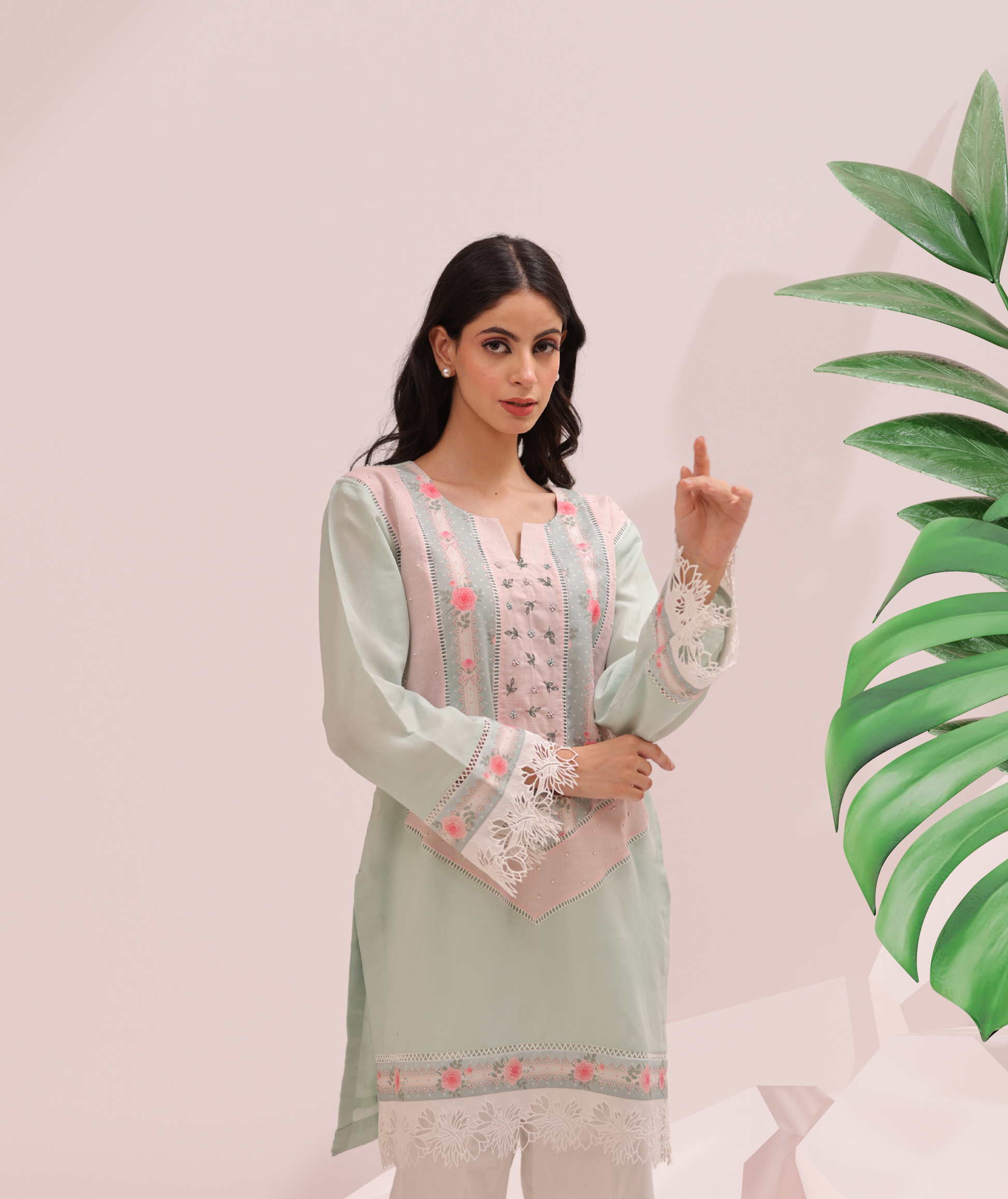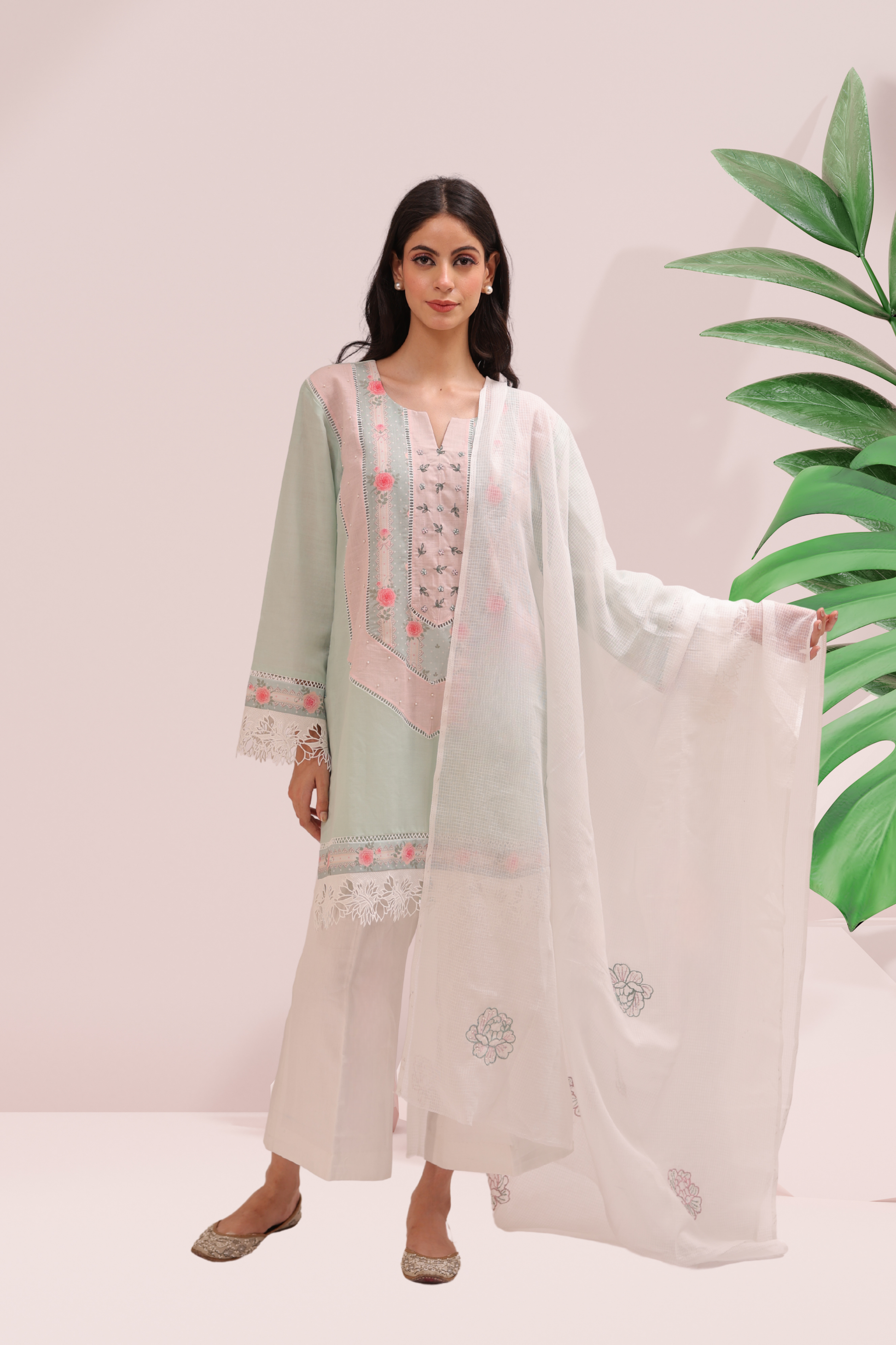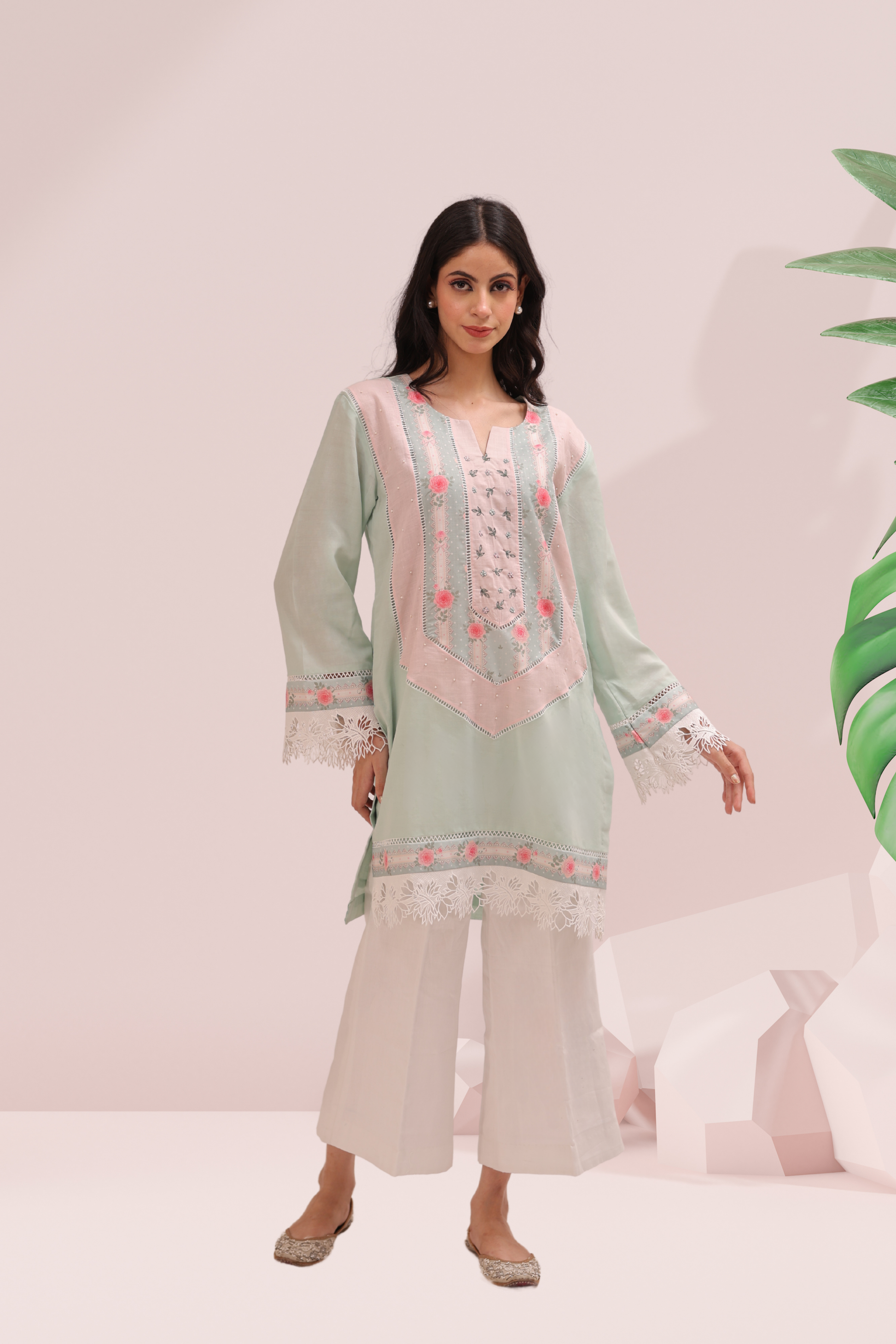 Elegance blooms in the soft tones of the Garden Whisper Set — a delicate expression of grace and craftsmanship. The cotton kurta features a pastel mint base highlighted by a hand-embroidered petal front panel, each panel stitched with care and framed by intricate lace trims. The silhouette flows into airy, wide-leg white cotton pants, offering both ease and sophistication.