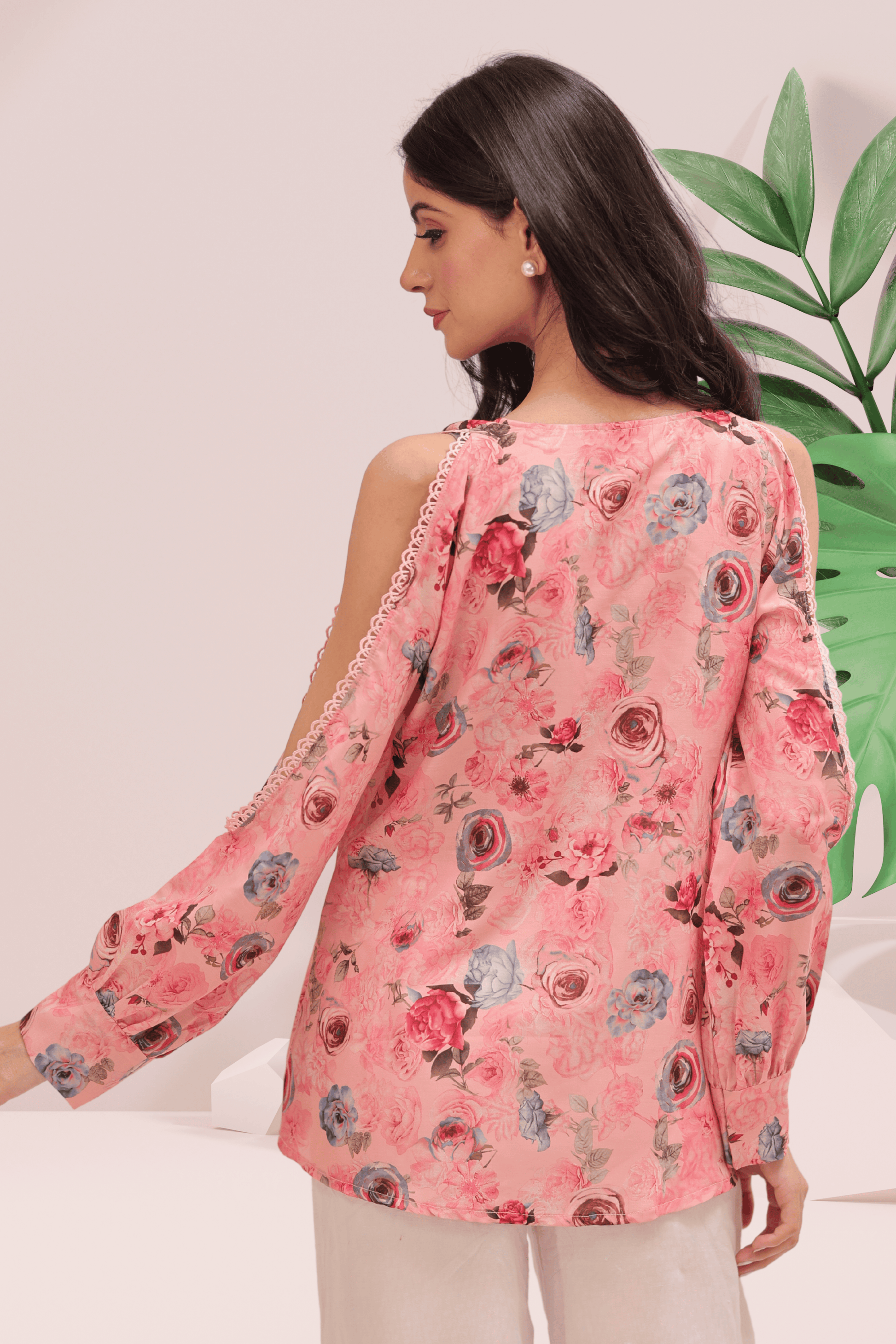 With cold shoulders trimmed in delicate lace and voluminous gathered sleeves, the silhouette balances softness and edge. The soft rose-pink base is printed with a medley of dusky florals — perfect for brunches, evenings out, or simply feeling lovely at work.