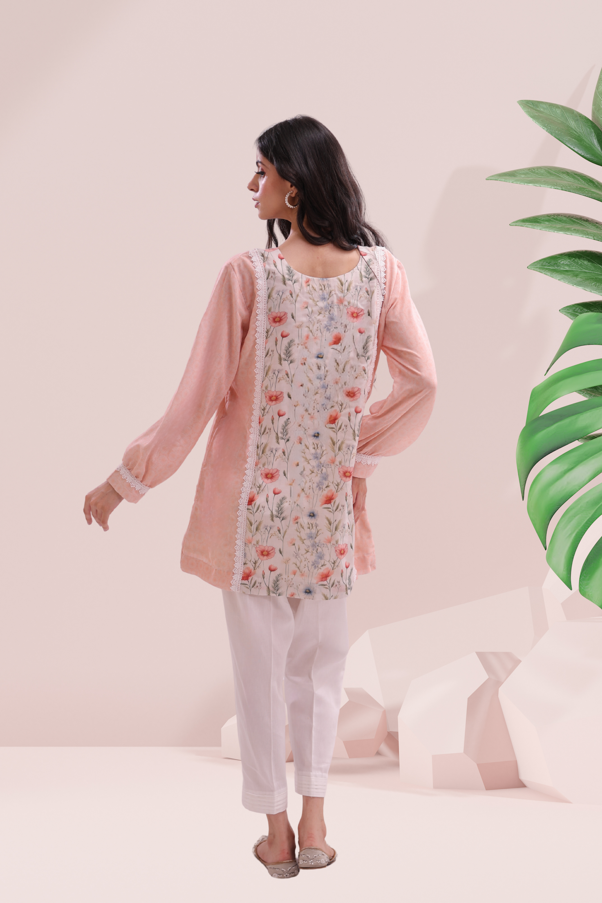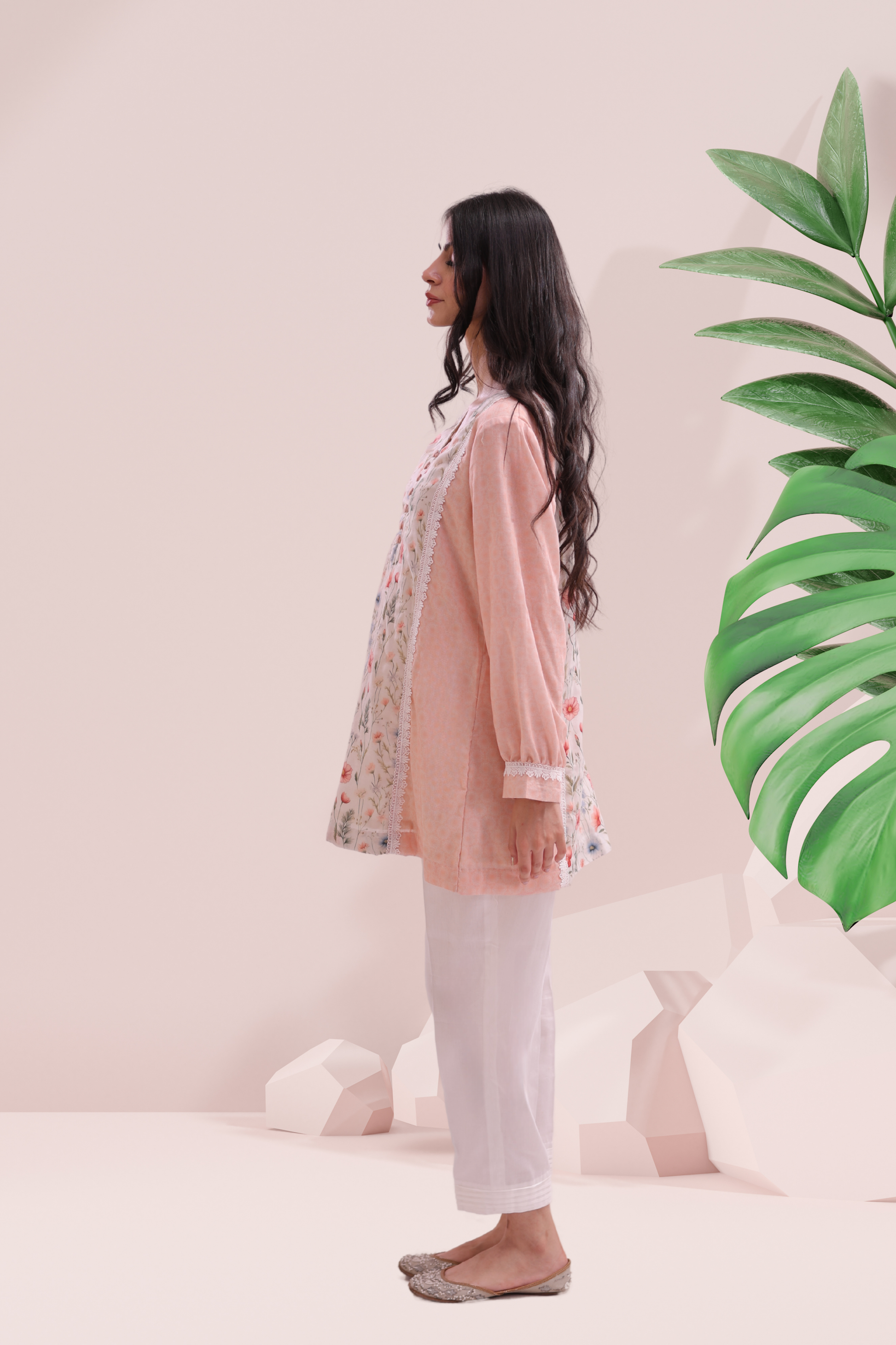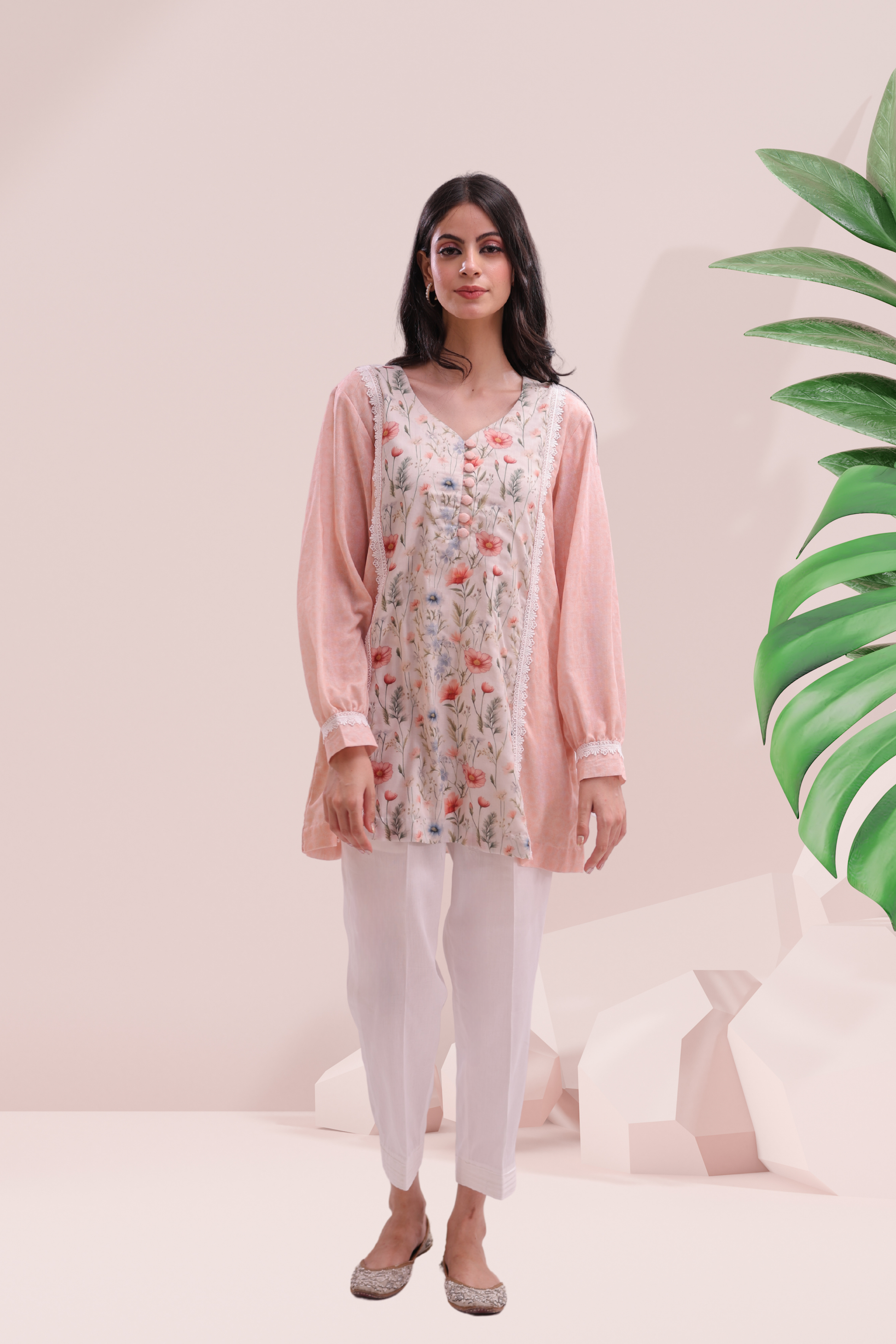 Soft, romantic, and endlessly wearable—the Sweet Pea Set is a breath of fresh air in your wardrobe. Crafted from premium cambric fabric, this two-piece ensemble features a floral printed kurta with delicate lace detailing that gently frames the silhouette. The pastel peach sleeves add a touch of warmth and femininity, while the white straight pants keep the look grounded in easy elegance. Perfect for slow summer days, brunches, or leisurely strolls in bloom-filled gardens.