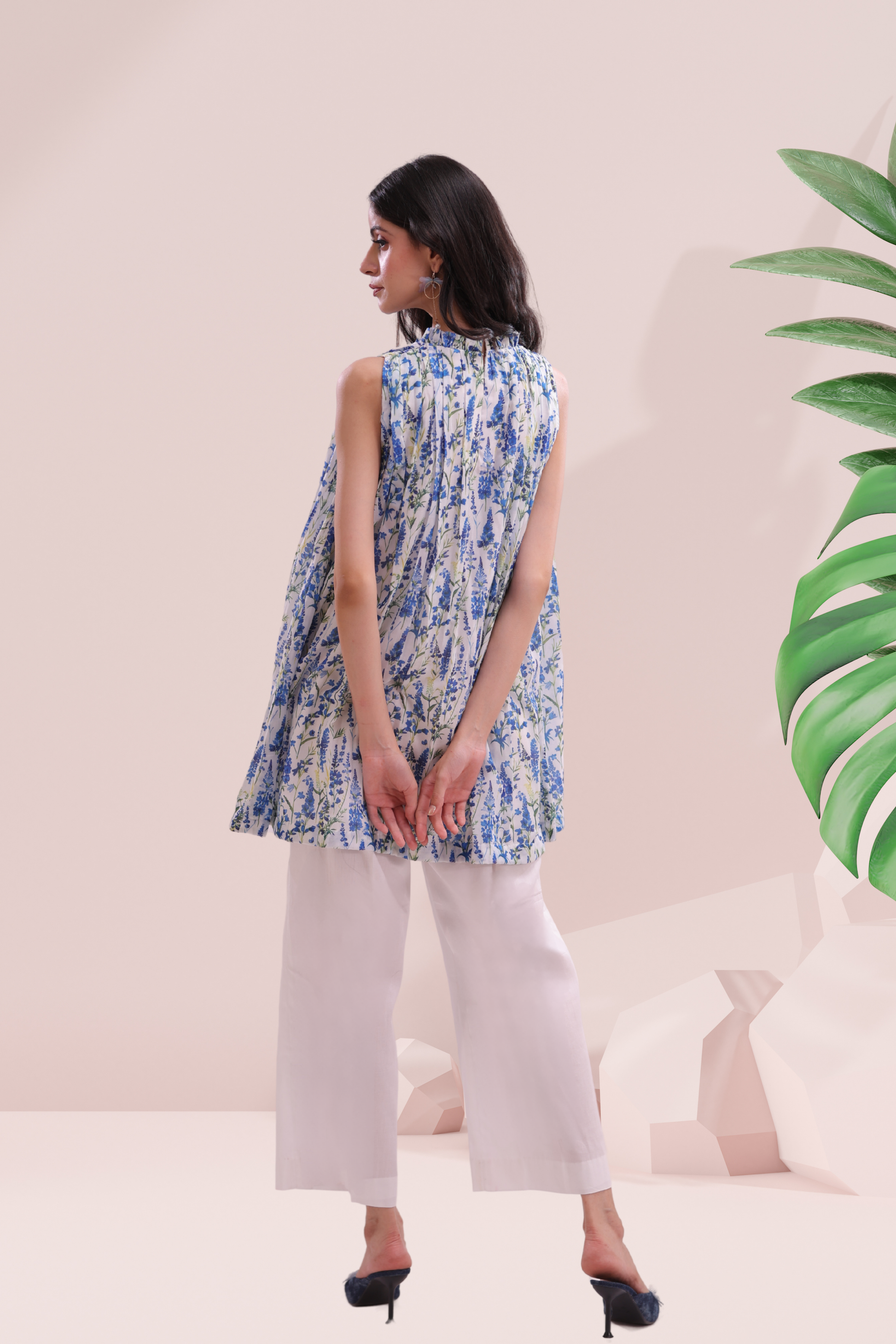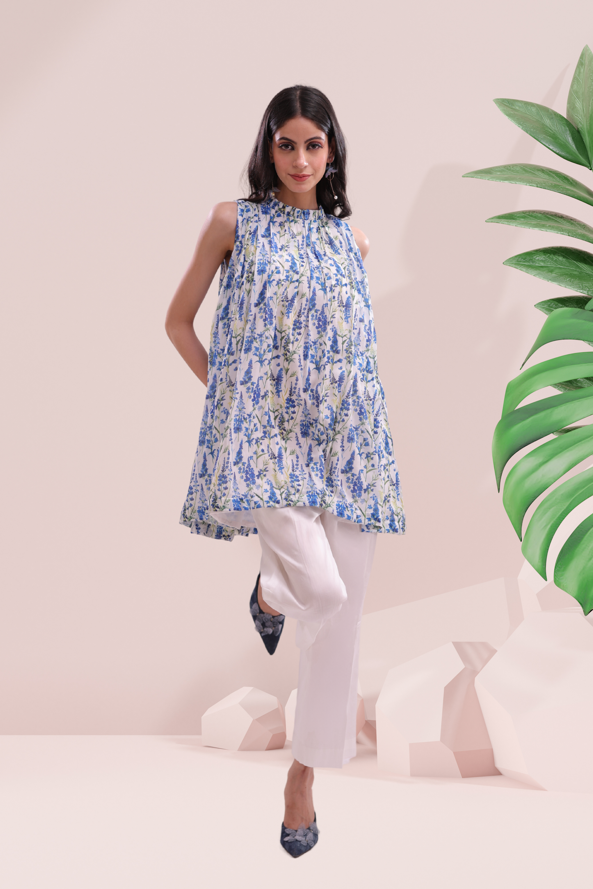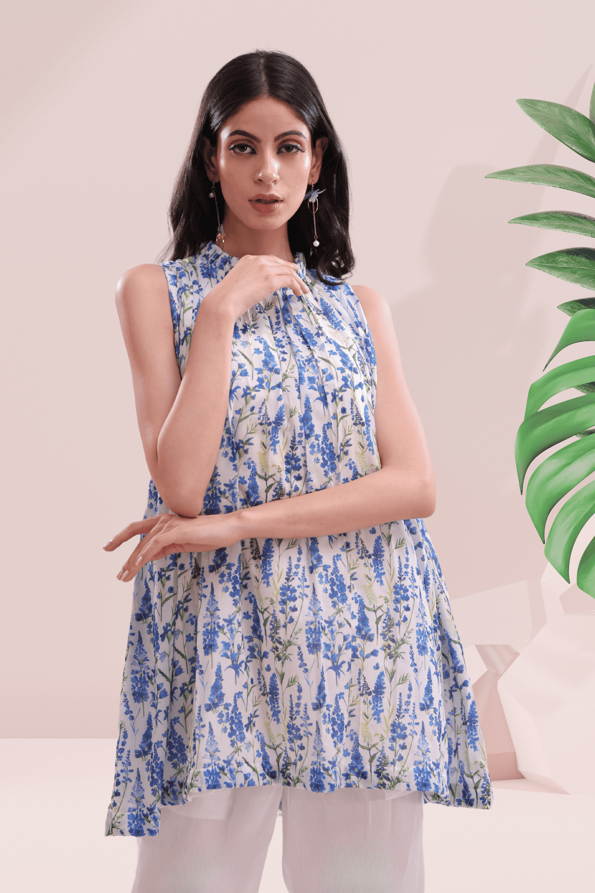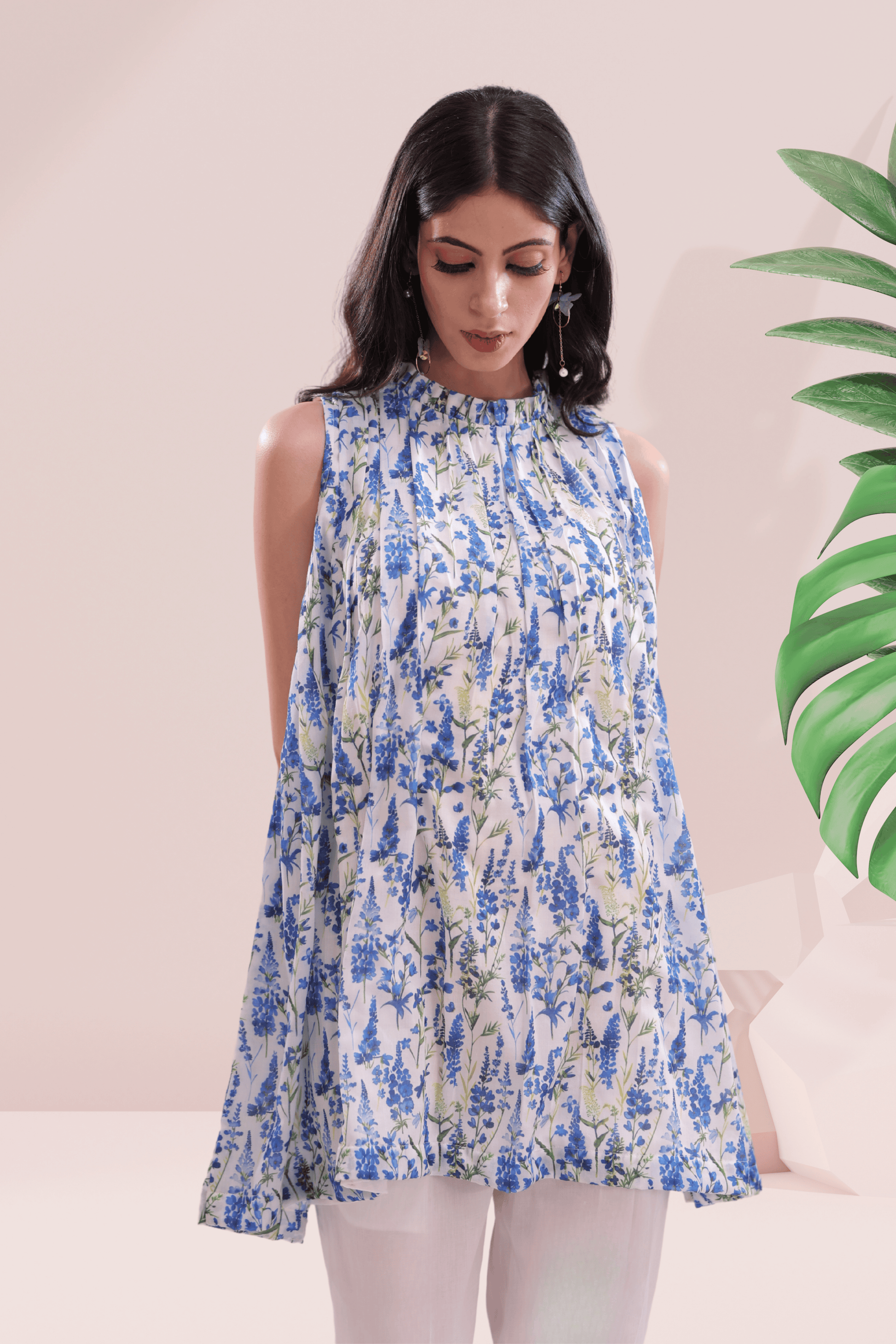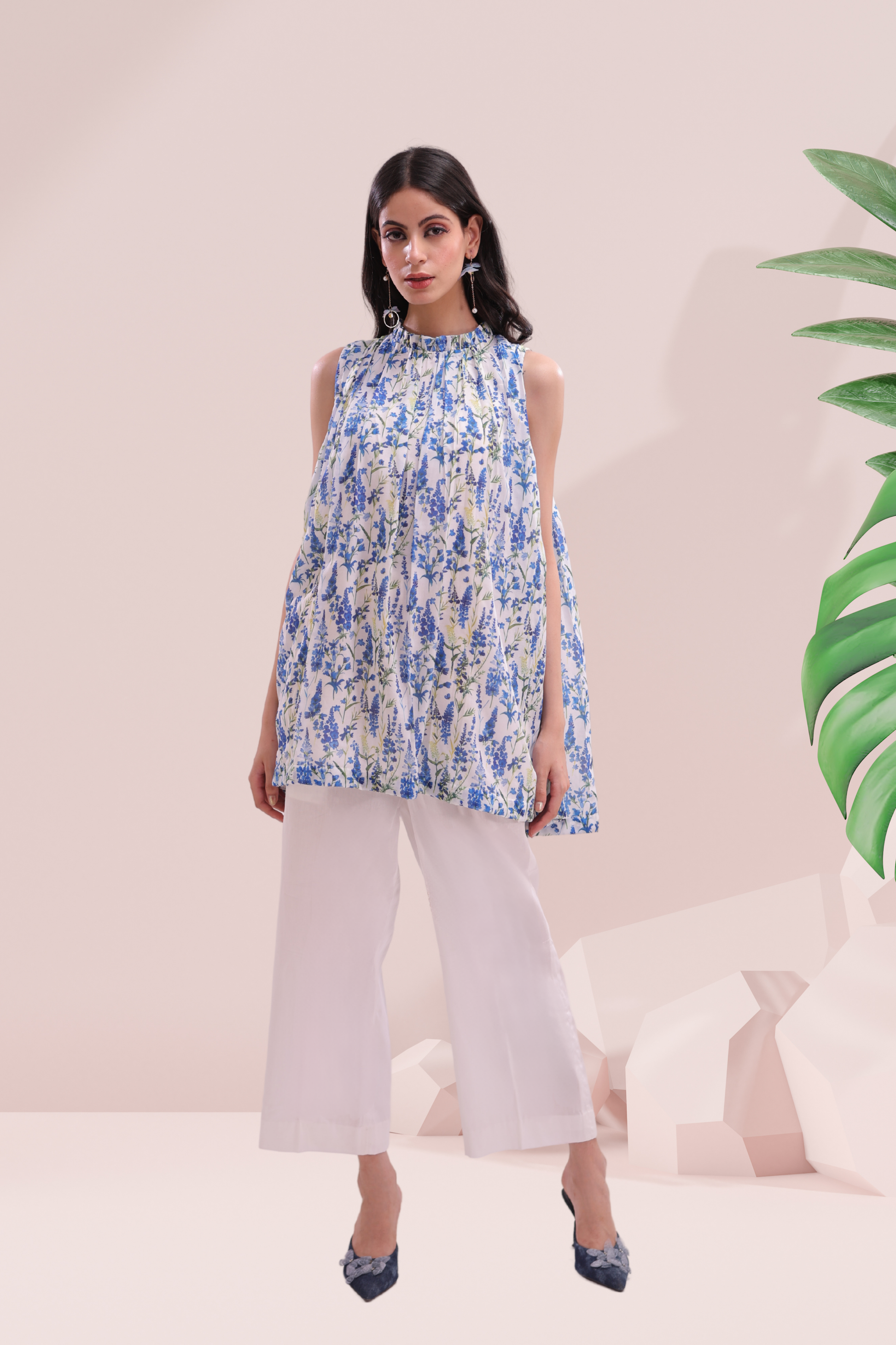 Breezy, bold, and beautifully botanical — the Veronica Co-ord Set brings a refreshing twist to everyday dressing. Featuring a flowy sleeveless tunic in soft cotton with a hand-drawn floral print in shades of blue and green, this look captures effortless summer charm. The gathered neckline and A-line silhouette offer a flattering drape for all body types. Paired with white wide-leg cotton pants, it’s perfect for warm-weather days that call for comfort and grace.