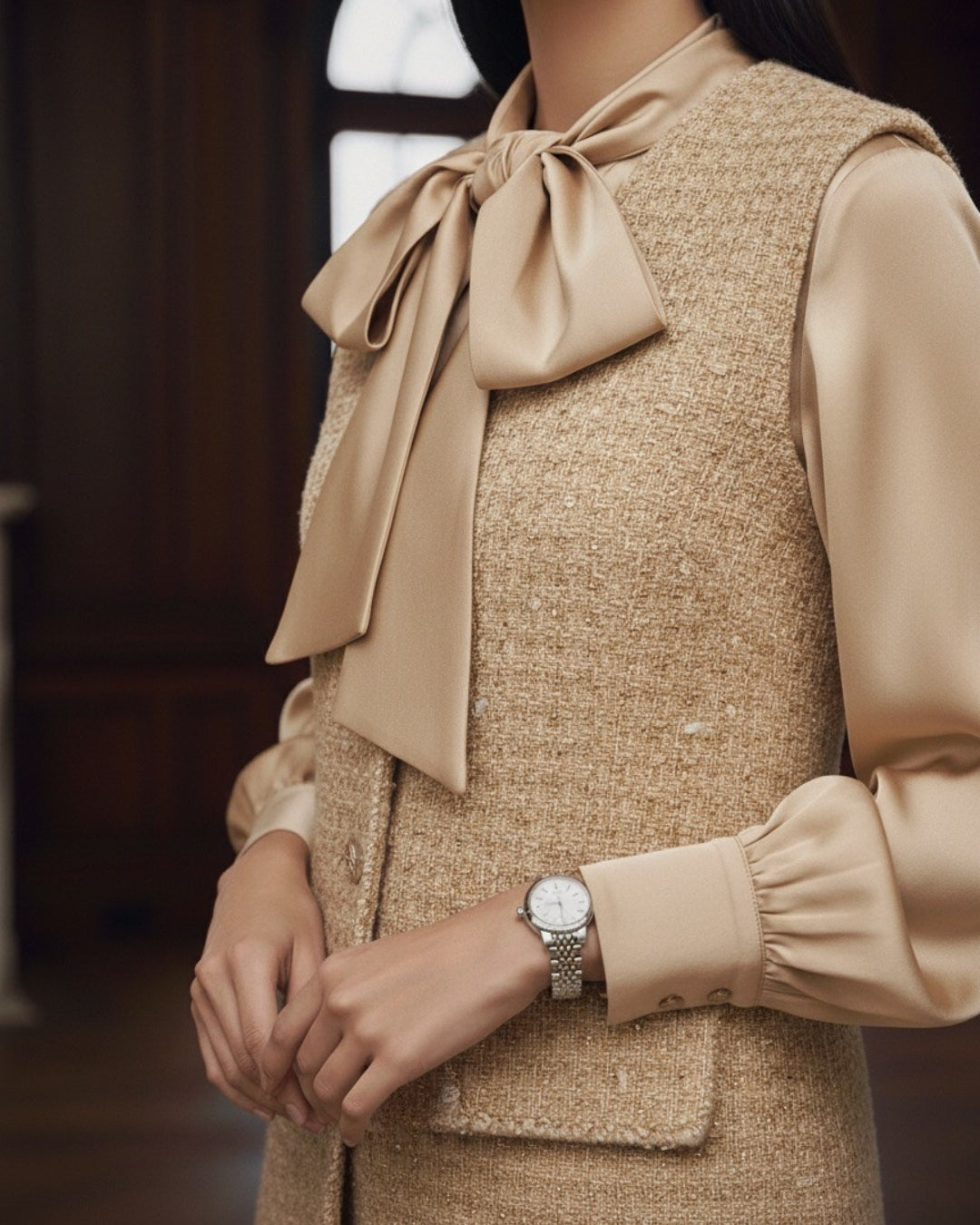 Paired with a luxurious satin blouse in a coordinating champagne tone, the bow-tie neckline adds a romantic, polished touch — creating a complete ensemble that feels both powerful and effortlessly graceful.